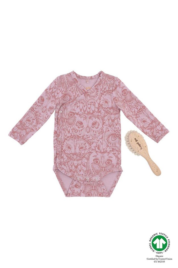 Babypakke fra Soft Gallery med en klassisk bodystocking i størrelse 0 måneder og en håndlavet babybørste.