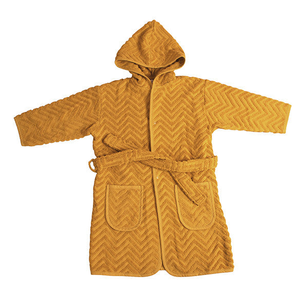 Filibabba morgonrock til børn 3-4 år i farven Golden Senap, lavet af 100% økologisk bomuld. Superblød og komfortabel med sicksackmønster, trykknapper, bindebånd, to forlommer og en hætte. Nem at vaske og holde, krymper maksimalt 5%. Perfekt til efter bad, strandture eller hygge derhjemme. Leveringstid ca. 14 hverdage.