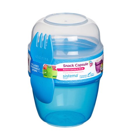 Sistema snackkapsel to-go är uppdelad i 2 fack. En välkänd Sistema Spork ingår som är halv gaffel och halv sked. Koppen är perfekt för t.ex. och toppen till topping och diverse saker som måste vara på toppen. Den rymmer 515 ml.
