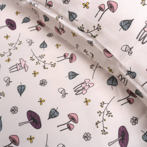 Sengeklæderne har et sødt og naturligt design, der passer til piger. Motivet indeholder fine svampe, blade og grene med lyserøde detaljer. Det er håndtegnet og inspireret af naturen. Sengeklæderne leveres i en matchende stofpose, som kan bruges til at opbevare legetøj eller tøj.