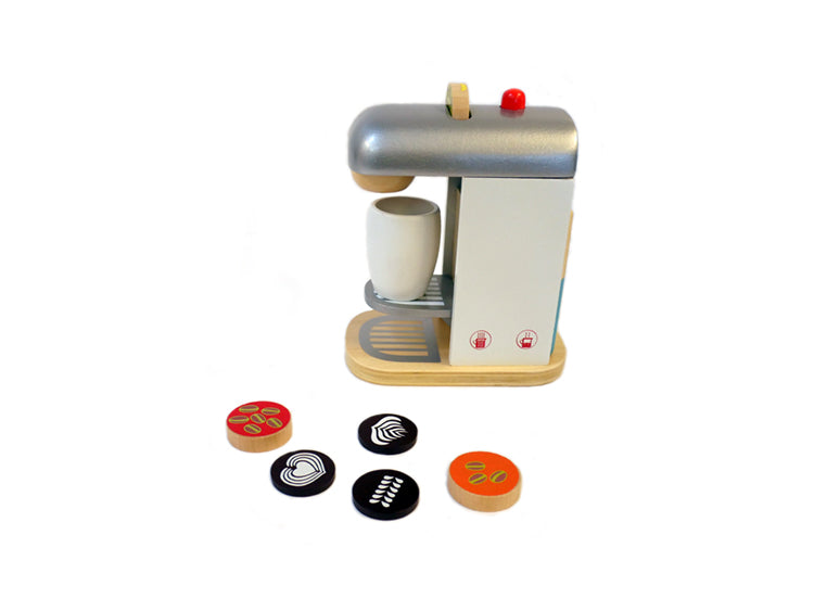 Denne flotte kaffemaskine fra MaMaMeMo er lavet af træ og har et stilrent design. Den kommer med 1 kaffekop, 3 kaffekapsler og 3 forskellige mønstre til at pynte på kaffen. Uden en god kaffemaskine kan du ikke blive en dygtig barista.