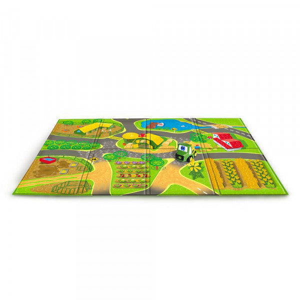 Kul lekmatta från John Deere som ser ut som ett landskap. Lekmattan är vikbar. Ett fordon ingår för lekmattan.