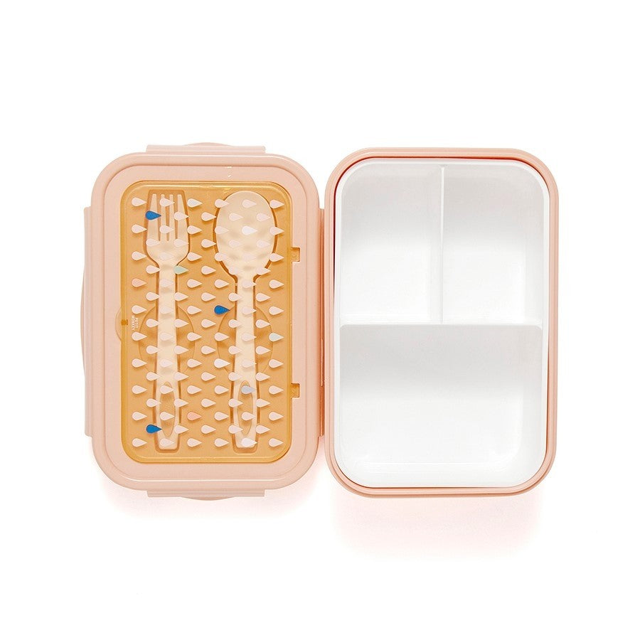 Flot madkasse med bestik fra Petit Monkey, opdelt i rum til f.eks. rugbrødssnacks og frugt, så de kan opbevares separat. En ske og en gaffel medfølger. Passer til drikkedunken i ferskenfarve.