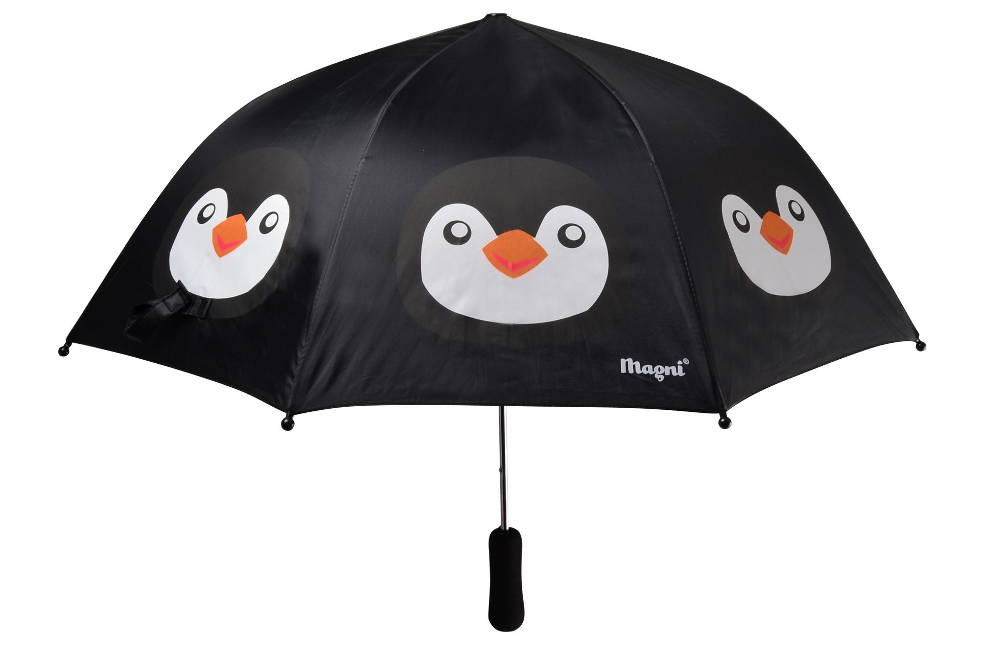 Detta supersöta paraply är från Magni och har de sötaste motiven av pingviner på utsidan. Alla barn skulle älska att ha ett paraply precis som mamma och pappa, så detta paraply är bara perfekt. Paraplyet har en längd på cirka 58 centimeter och en diameter på cirka 72 cm. Handtaget är mjukt och därför bekvämt att hålla i, och det stängs även med kardborreband. Allt som allt ett perfekt paraply för den lilla som bara vill ut i regnet.