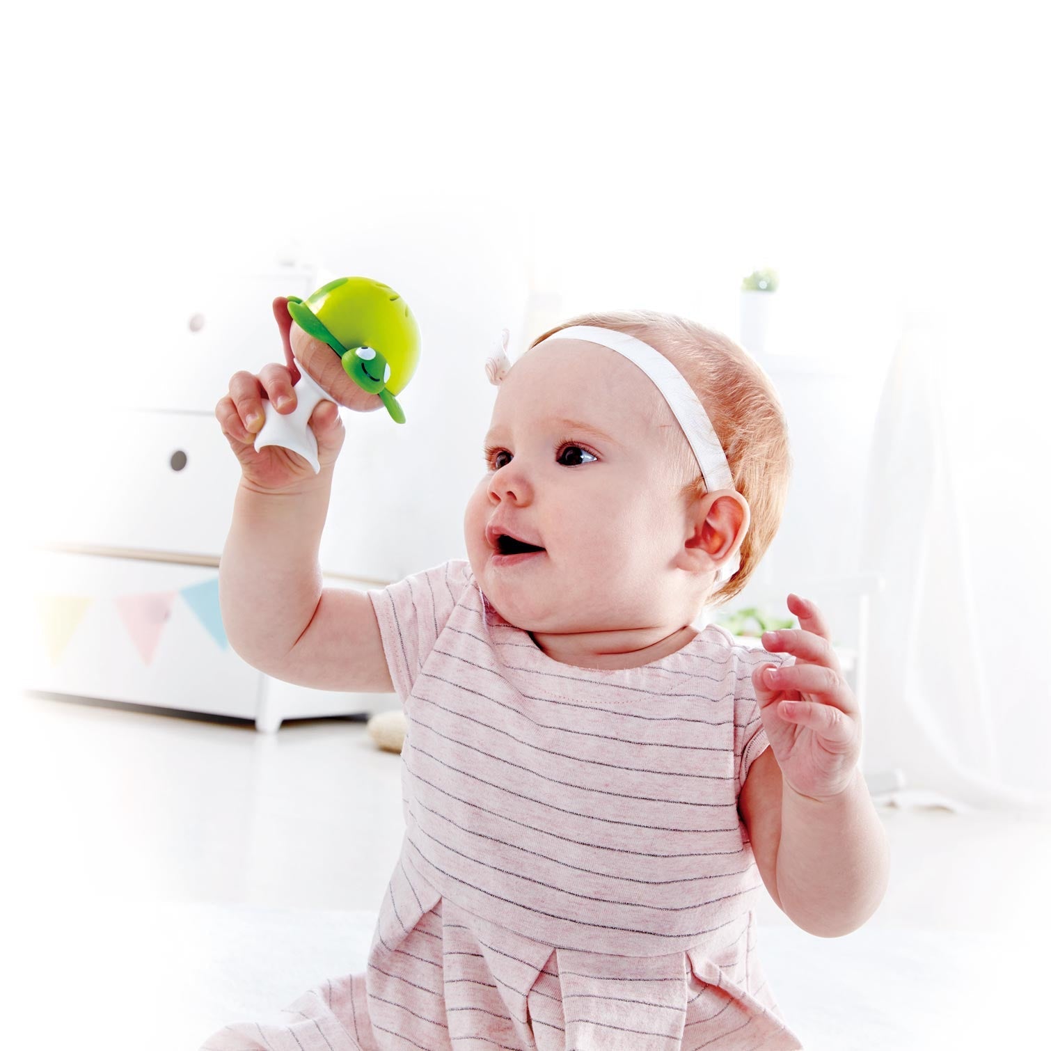 Sødt rangle-sæt fra Hape med en hval, skildpadde og en blæksprutte. Hver rangle har en sugekop i bunden, så de kan sættes fast på gulvet eller bordet, så barnet kan trykke dem uden at de vælter - og de laver også nogle dejlige raslende lyde.
