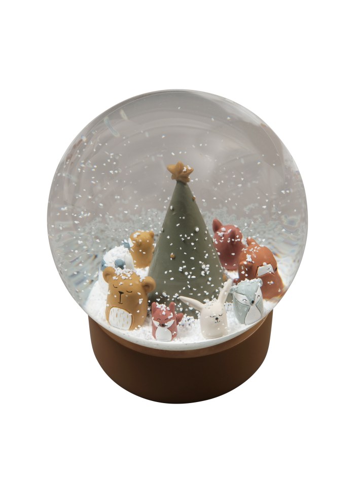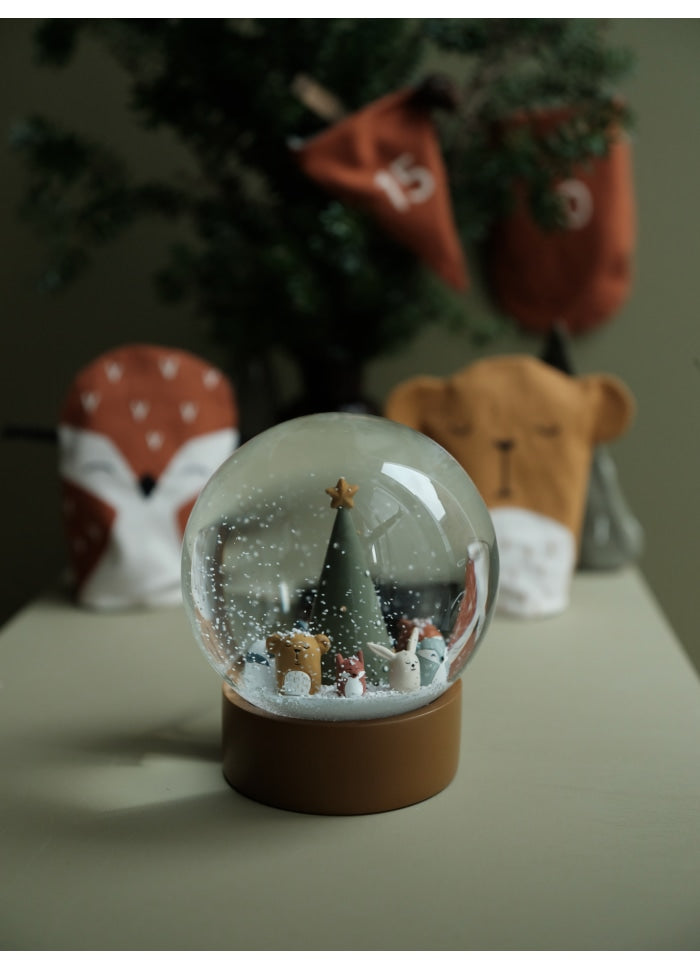Snöklot med skovens dyr, perfekt til vinterdekoration.