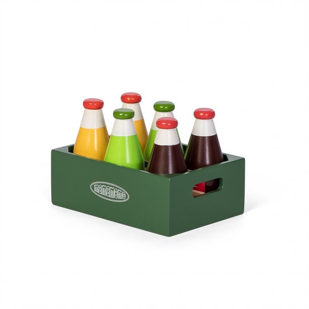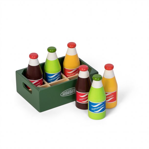 Söta små träläsk från Mamamemo, perfekt att leka i lekköket! 2 orange vatten, 2 sport och 2 cola ingår - samlade i en fin liten trälåda.