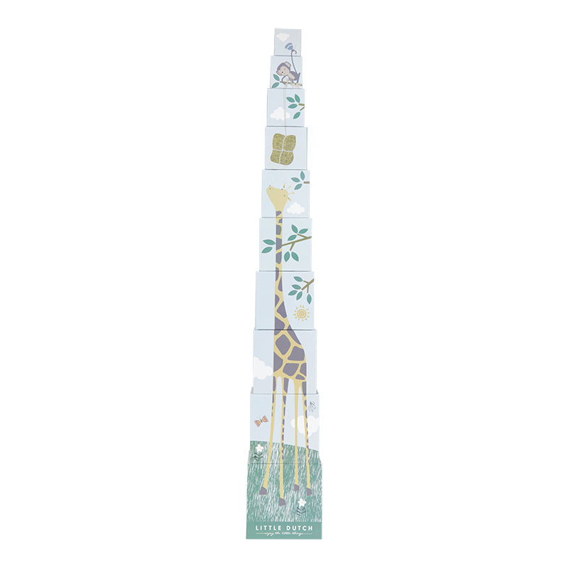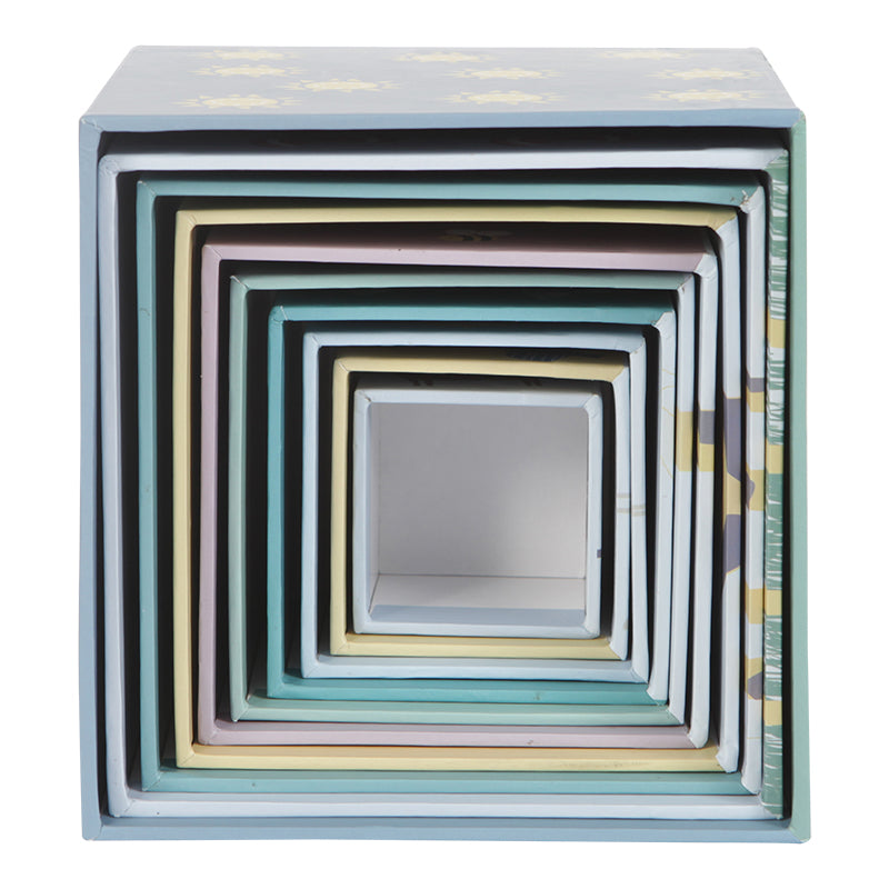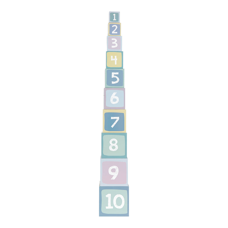 Stort stapletårn med 10 kasser i forskellige størrelser. Kasserne er lavet af kraftig pap og har flotte tryk med dyr og tal. Det udfordrer dit barns sprog og motorik.