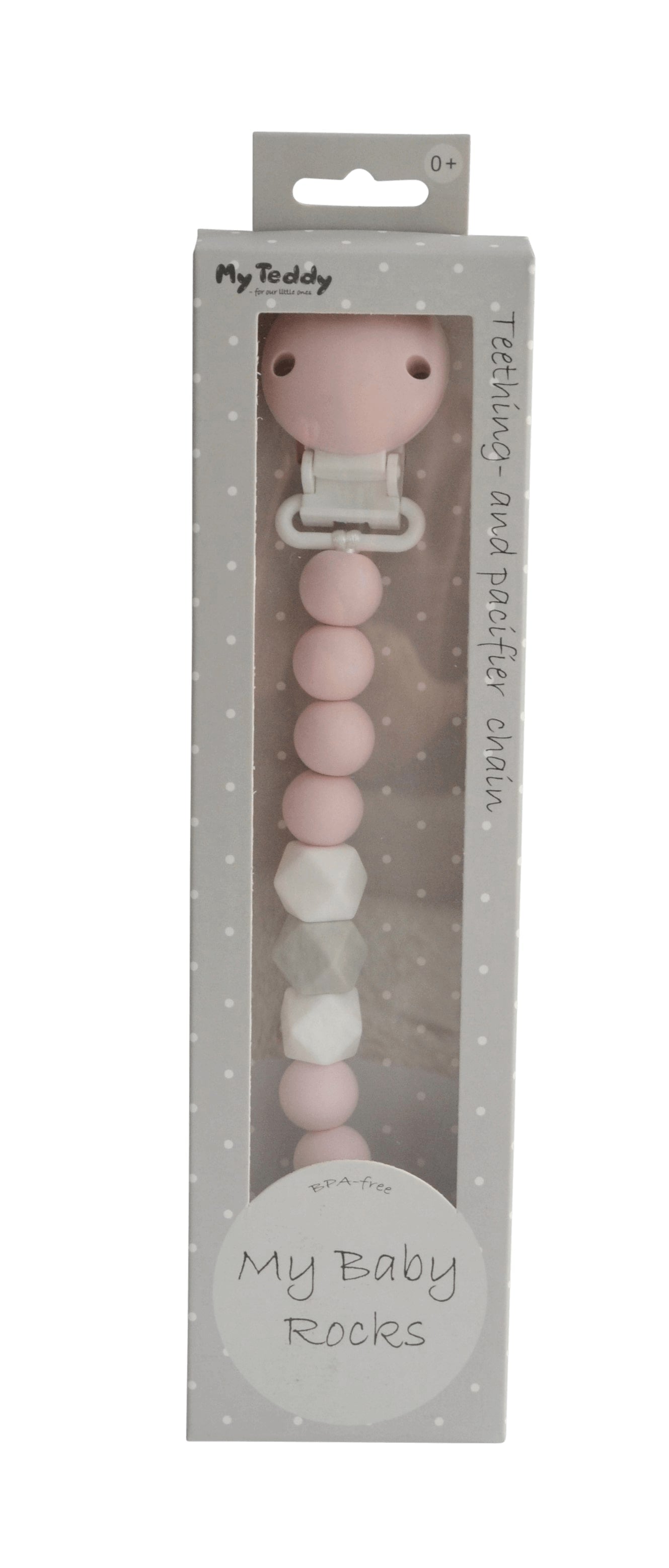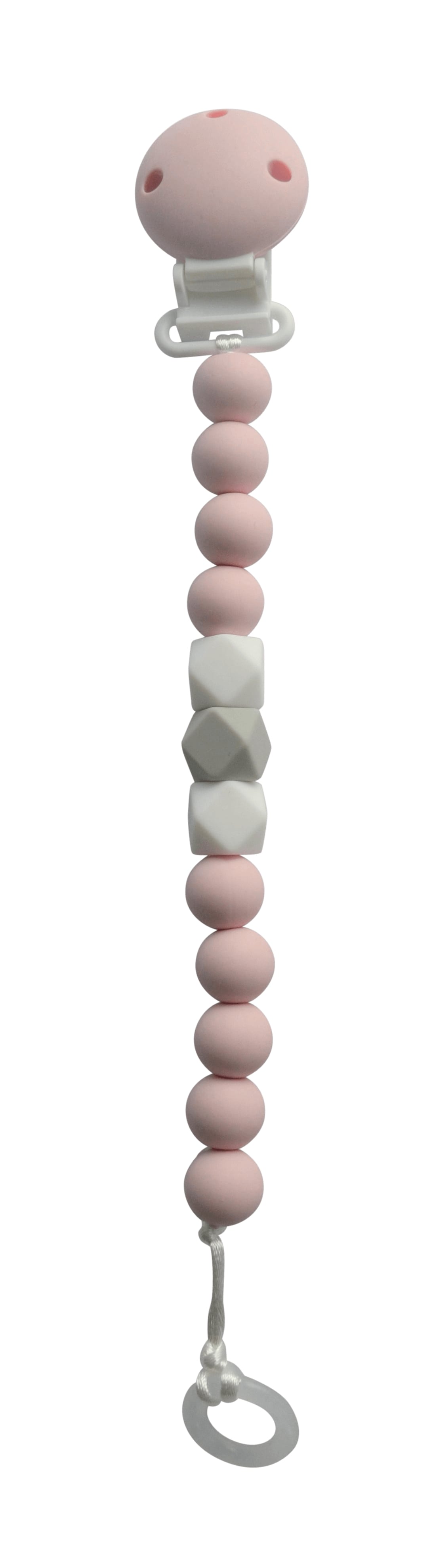 Sød suttekæde i lyserød, grå og hvid, som også kan bruges som bidering til ømme gummer.