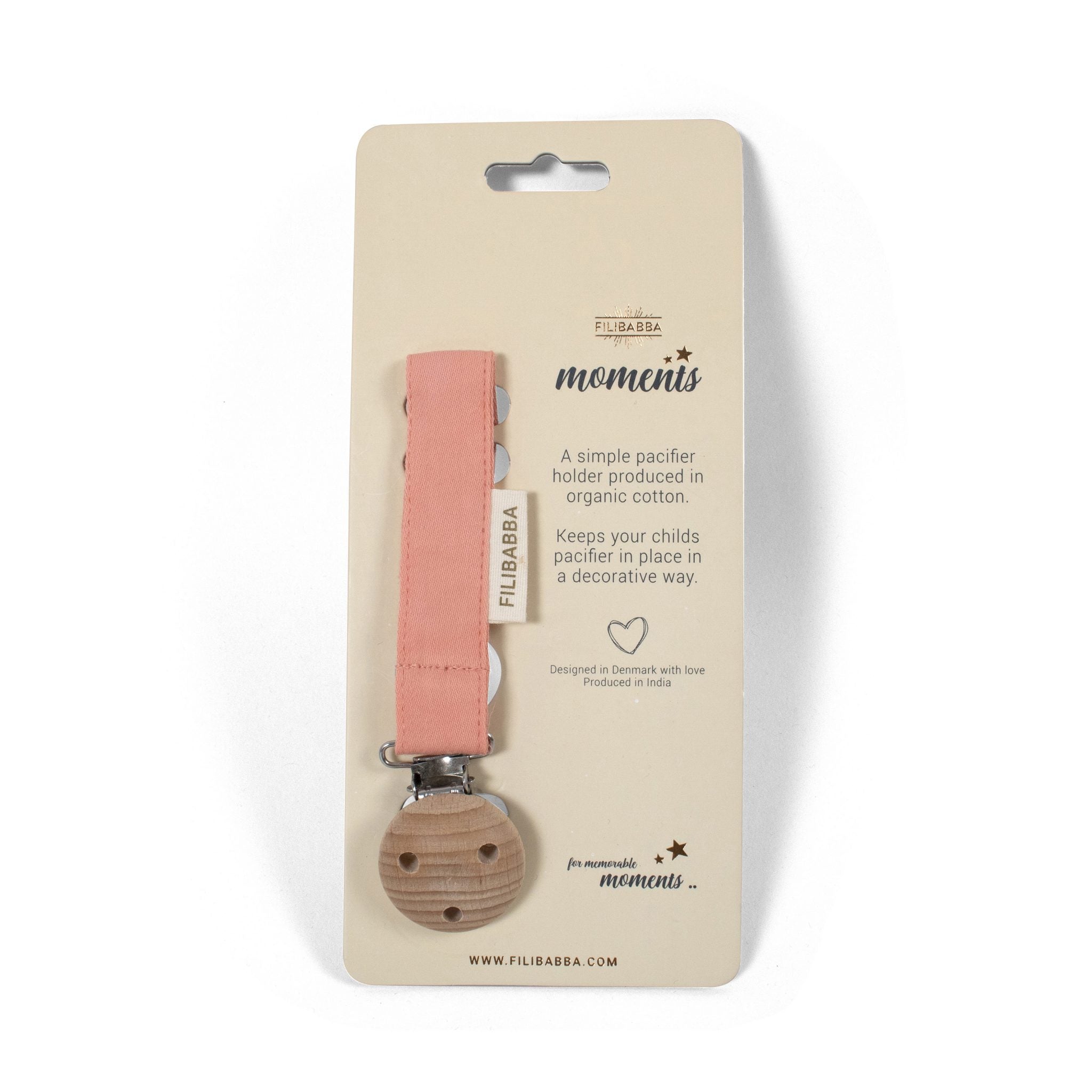 Denne napphållaren i en vakker korallfarge er både praktisk og stilfull. Laget av høykvalitets materialer, sikrer den at barnets smokk alltid er innen rekkevidde og holder den ren og trygg. Den enkle klipsen festes lett til klær eller barnevogn, og den myke stroppen er skånsom mot barnets hud. Perfekt for både hjemmebruk og på farten.