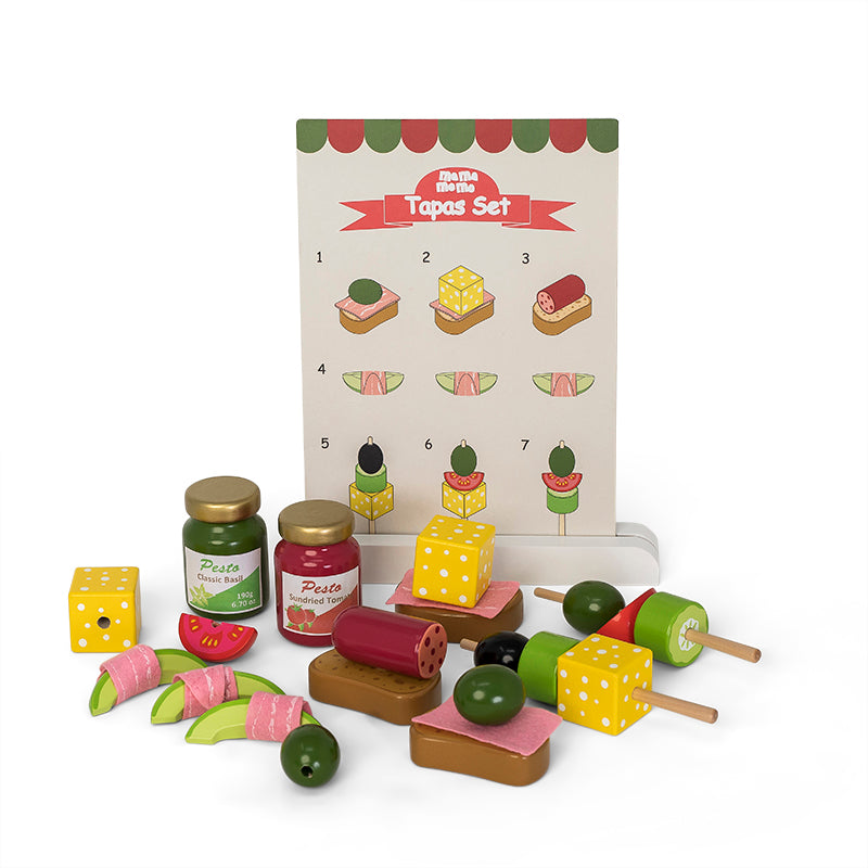 Mysigt tapasset från Mamamemo som är gjort i trä. Ett menykort och totalt 29 olika delar ingår. Den kan med fördel bytas ut mot godisbutiken Mamamemo så att den lille får lite tapasbikar i lekköket istället.