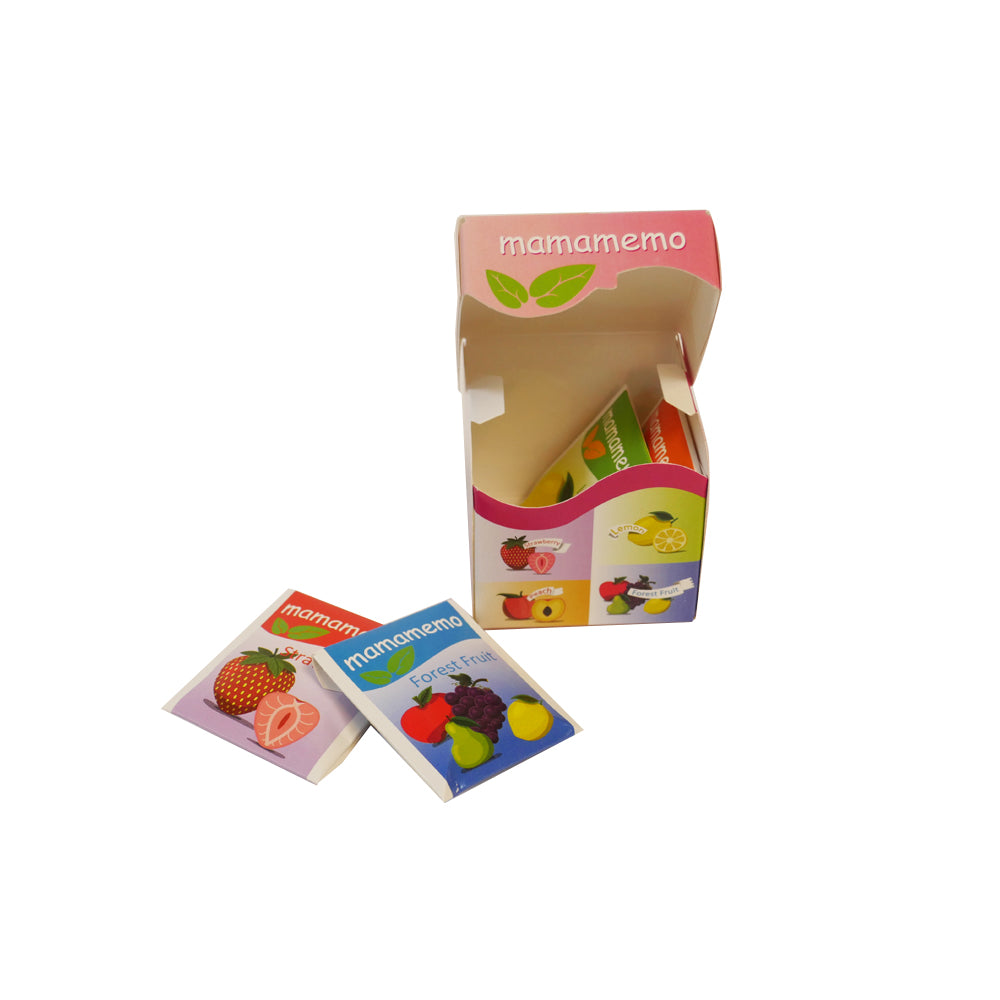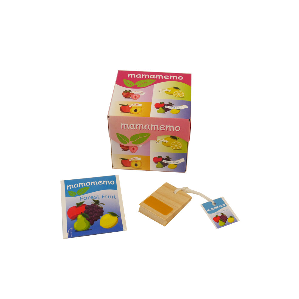Sød lille legemad i træ fra MaMaMeMo, der ligner et tebladspakke. Indeni pakken er der 4 små teblade med forskellige 'smage'. Dette giver børn mulighed for at lege i køkkenet i timevis og bruge deres fantasi til at lege butik.