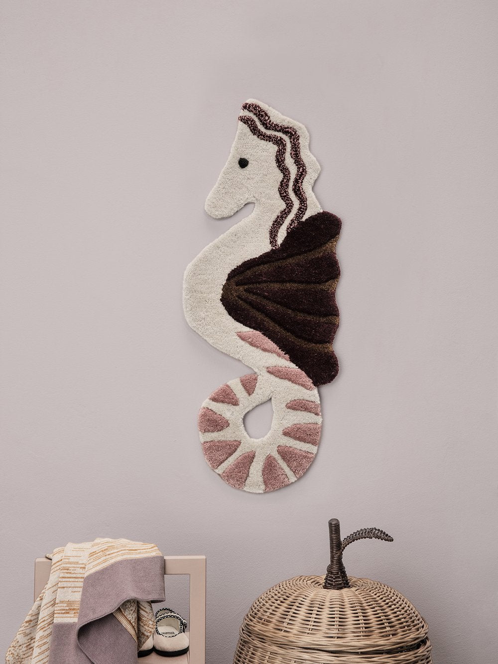 Denne håndtuftede søhest-tæppe fra Ferm Living til børneværelset har flotte detaljer og farver. Det dynamiske udtryk skabes af de varierende højder i tuftningen. Mål: 34x2x86 cm. Materiale: 100 % tuftet nyzeelandsk uld, 100 % bomuld. Støvsug ofte i starten og brug professionel rengøring til pletter.